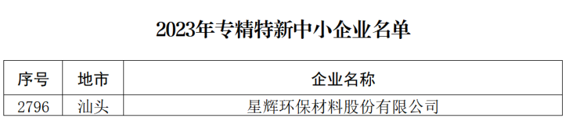 近日,廣東省工業和信息化廳公布了“2023年廣東省專精特新中小企業名單”(通告[2024]1號),星輝環材(以下簡稱“公司”)成功通過廣東省“專精特新”企業認定。